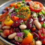 This vibrant bean salad is a delightful blend of fresh green beans, kidney beans, colorful bell peppers, and red onion, all tossed in a zesty lemon-oil dressing. It’s a perfect refreshing dish for any occasion, quick to prepare and bursting with fresh flavors.