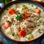 Diese cremige Hühner-Reis-Suppe ist ein wärmendes und sättigendes Gericht für die ganze Familie. Sie kombiniert zartes Hühnchen, frisches Gemüse und Reis in einer reichhaltigen, cremigen Brühe.