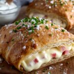 This Handbrot, reminiscent of a Christmas market treat, features a soft yeast dough generously filled with seasoned chicken or beef, fresh bell peppers, and onions. It’s a comforting and flavorful baked delight perfect for a cozy meal.