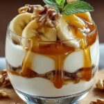 Die optische Gestaltung ist entscheidend für den ersten Eindruck. Lege einige der vorbereiteten Bananenscheiben dekorativ auf die oberste Schicht des Joghurts. Verteile die restlichen gehackten Walnüsse großzügig darüber, sodass sie eine ansprechende Texturkontrastschicht bilden. Ein paar frische Minzblätter oder ein kleines Sträußchen Zitronenmelisse verleihen dem Ganzen eine frische, grüne Note und machen das Gericht optisch noch interessanter. Wer es gerne etwas raffinierter mag, kann auch noch einen Hauch von essbarem Glitzer oder ein paar essbare Blüten darüber streuen.