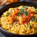 Proteinkick: Füge dem Risotto vor dem Servieren gegrillte Hähnchenbruststreifen, gebratenen Tofu oder geröstete Kichererbsen hinzu. Eine vegetarische Variante könnte auch mit Linsen angereichert werden, die zusammen mit dem Reis gekocht werden, um eine sättigendere Mahlzeit zu kreieren. Diese Ergänzungen machen das Kürbisrisotto zu einer vollwertigen Mahlzeit, die dich lange satt hält.