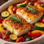 A flavorful Mediterranean bake featuring cod, bell peppers, and zucchini, seasoned with herbs and lemon for a healthy and delicious meal.