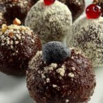 Garniere die Kugeln mit frischen Beeren wie Himbeeren, Blaubeeren oder Erdbeeren. Die fruchtige Säure der Beeren bildet einen wunderbaren Kontrast zur Süße und Cremigkeit der Kugeln. Du könntest auch einen kleinen Minzzweig hinzufügen.