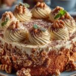 Beginnen Sie mit einer weiteren Schicht Frischkäsecreme oder einem leichten Zuckerguss. Sie können auch einige der gerösteten Nüsse, die Sie für den Teig verwendet haben, grob hacken und als Garnitur auf die Oberseite streuen. Dies betont den Nussgeschmack und verleiht der Torte zusätzliche Textur. Eine andere Möglichkeit ist, die Torte mit leicht gesüßter Schlagsahne zu umhüllen und diese dann mit zusätzlichen gehackten Nüssen oder feinen Schokoladenraspeln zu bestreuen.