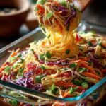 This vibrant Thai Spaghetti Salad features al dente noodles, tender chicken, and crisp vegetables all tossed in a rich, homemade peanut sauce. Garnished with fresh cilantro and crunchy peanuts, it’s a flavorful and satisfying meal perfect for any occasion.