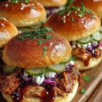 Saftiges, zerkleinertes Hähnchen in rauchiger BBQ-Sauce, serviert auf weichen Mini-Brötchen mit knackigem Krautsalat und frischen Zwiebeln. Ein einfacher, aber geschmackvoller Genuss für jede Gelegenheit.