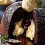 Eine Kugel hochwertiges Vanilleeis schmilzt langsam über dem noch leicht warmen Kuchen und ergänzt die Schokoladen- und Cheesecake-Noten perfekt. Selbstgemachte Schlagsahne, leicht gesüßt und mit einem Hauch Vanille verfeinert, ist ein klassischer Begleiter.