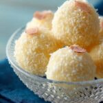 - Wälzen Sie jede Kugel in einer Mischung aus weiteren Kokosraspeln oder gehackten Nüssen Ihrer Wahl.